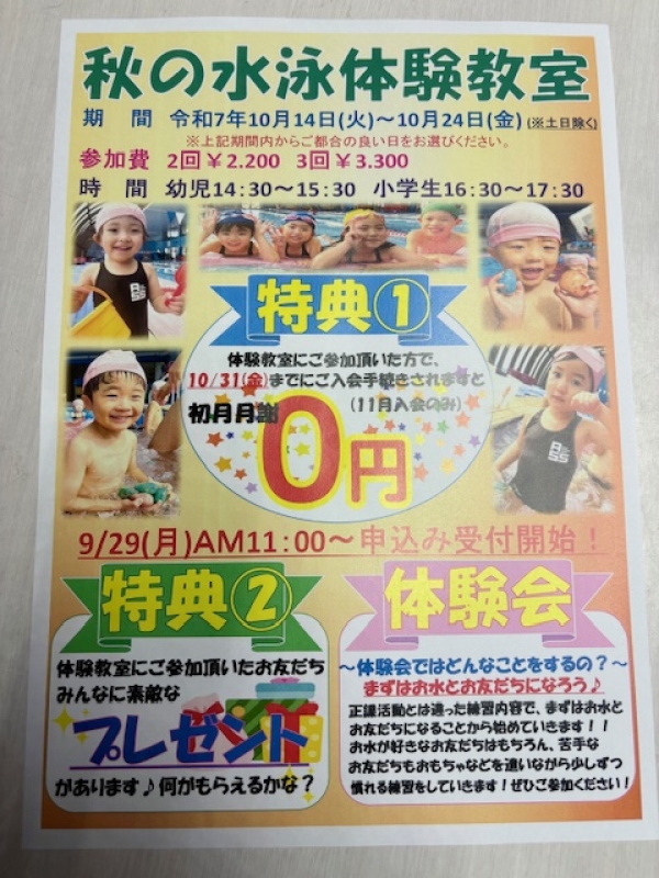- ★秋の水泳体験教室申込スタート★